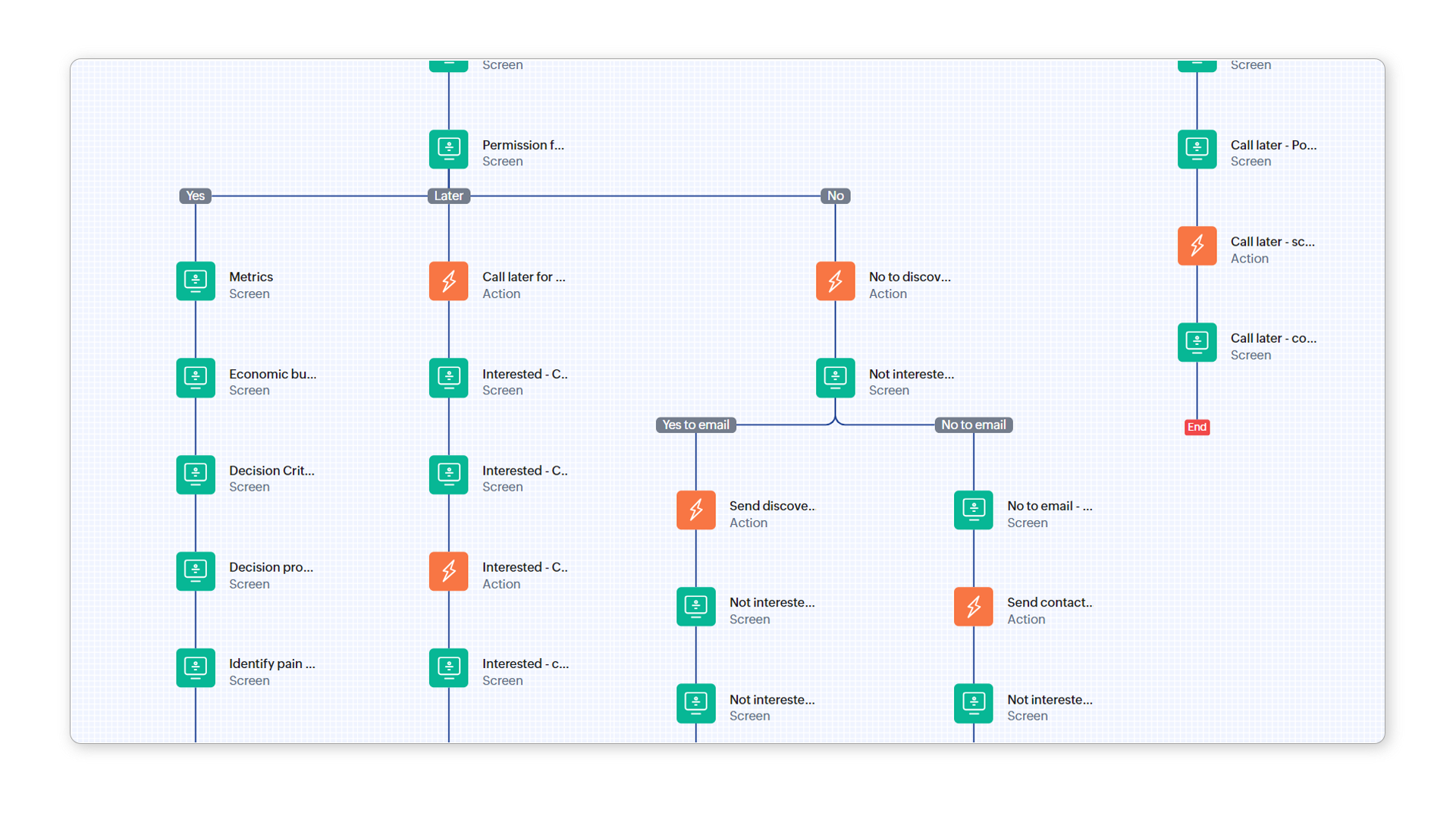 W Zoho CRM przepływy procesów można tworzyć za pomocą niskokodowego kreatora przepływów procesów. Można tworzyć przepływy procesów obejmujące wiele przypadków użycia, ale ostatecznie wszystkie przepływy procesów są takie same, ponieważ składają się z kilku podstawowych elementów: ekranów, decyzji i działań, które są dodawane, konfigurowane i łączone na wiele sposobów. Przepływy procesów są obsługiwane w piaskownicach CRM, dzięki czemu można je przetestować w piaskownicy przed wdrożeniem ich w środowisku produkcyjnym.